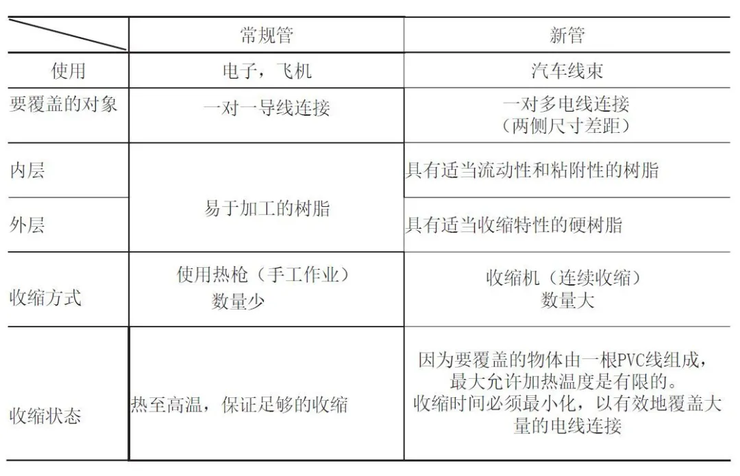 通常,傳統(tǒng)的雙壁管用于保護(hù)一對一的電線連接??梢院翢o困難地用熱空氣或其他加熱設(shè)備(250-350°C)將管道收縮。另一方面,為了保護(hù)汽車線束的連接,需要滿足以下四個特定條件: