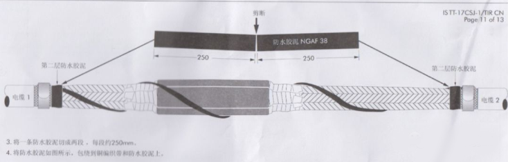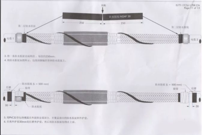 3)內(nèi)護(hù)套防水處理(首層):從一端鎧裝斷口(內(nèi)護(hù)套上)開始將防水帶拉長(zhǎng)至約1.5倍以半搭疊方式繞包至另一鎧裝斷口(防水帶膠粘層應(yīng)緊貼內(nèi)護(hù)套),然后從防水帶外以三分之一搭疊方式繞包PVC膠粘帶(50mm寬)一層,將防水帶完全覆蓋。