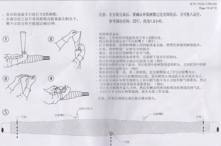 其他國(guó)外廠家注膠防水安裝工藝圖與上述N產(chǎn)品差別不大。A、Q產(chǎn)品不包含第二步,其灌注的樹脂為單一樹脂,不需要攪拌,直接灌注。