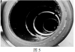 事端分支箱電纜終端所運用的硅脂密封功用不良,故障產(chǎn)生后,當(dāng)拆撥其它兩相電纜頭時,因為硅脂呈現(xiàn)干枯粘結(jié)(如圖5),需求多人合力才調(diào)撥出,可見硅脂已不能起到光滑防潮與絕緣的作用,不能與電纜頭同“呼吸”,彈性功用大為下降。