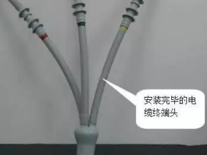 然后分別套入冷縮直管,與三叉手套“手指”部分至少搭接15mm,逆時針抽取芯繩使其收縮,依次完成三相的安裝。