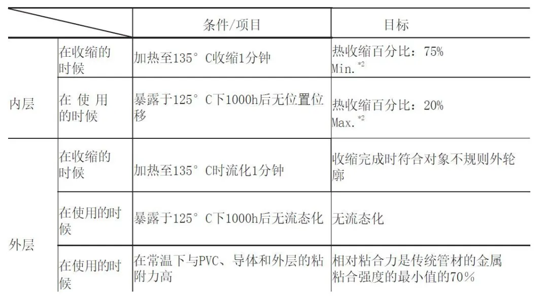 為了防止PVC線在熱收縮過程中發(fā)生熱降解,必須將過程溫度控制在100°C或更低。為了滿足上述要求,我們在自動收縮機中測量了最大加熱溫度和時間,發(fā)現(xiàn)可以將管道加熱到135°C持續(xù)一分鐘。將管道加熱到此溫度時,其外層必須完全收縮,而內(nèi)層則需要流動并符合被遮蓋對象的不規(guī)則外部輪廓。另一方面,在125°C的使用溫度下,要求管道顯示出適當?shù)慕^緣和密封性能,同時又不使管道和粘合劑位移。表2和表3分別顯示了用于新管的材料的開發(fā)目標及其目標特性。