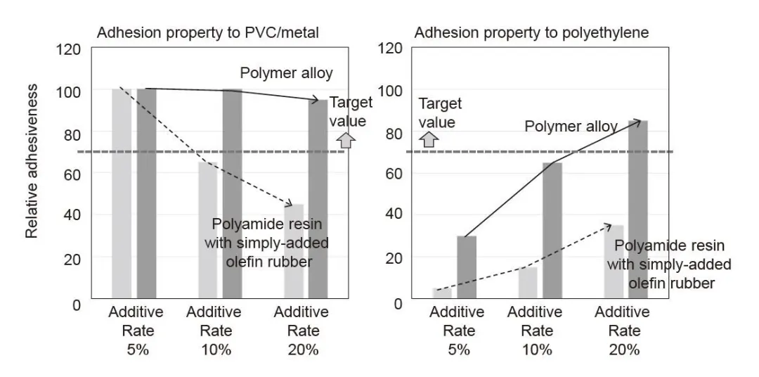 圖9.聚酰胺樹脂與簡單添加的烯烴橡膠和聚合物合金之間的粘合力差異