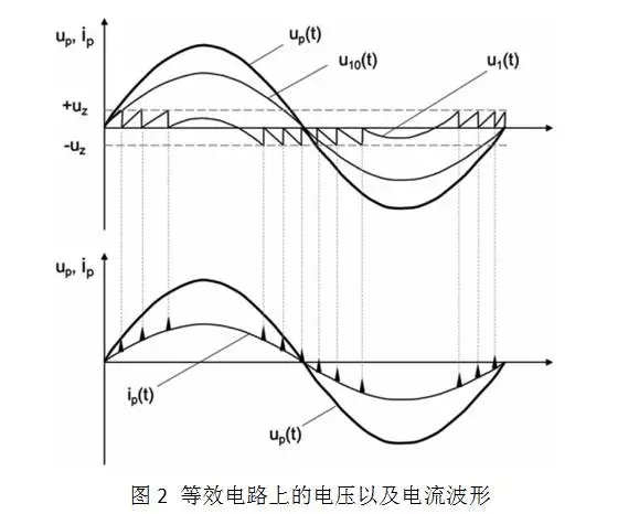 等效電路的電壓與電流波形如圖2所示。電壓UP(t)為施加在主絕緣上的體系電壓,U10(t)為空地上的電壓。當(dāng)U10電壓升高到空地的擊穿電壓UZ時,空地?fù)舸珻1兩端電壓降落,空地絕緣恢復(fù),同時C2被充電,當(dāng)U10高于擊穿電壓Uz時,以上進(jìn)程反復(fù)發(fā)作。而每次局放時,都將會在絕緣走漏電流上疊加一個小的脈沖放電,如圖2所示。經(jīng)過檢測放電脈沖發(fā)作的位置、時辰以及幅值,我們可以對設(shè)備的絕緣運(yùn)轉(zhuǎn)狀況停止點評。