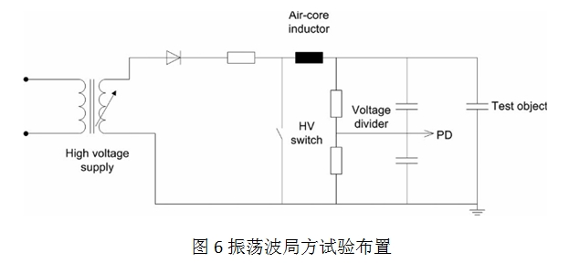 振動波實驗安頓如圖6所示,可以看做快速開關(guān)與諧振電路的分離。其實驗原理為,經(jīng)過直流電源對電纜停止充電,在抵達(dá)必定電壓后開關(guān)忽然合上,此時電纜與電感構(gòu)成串聯(lián)回路,電纜(大電容)中貯存的能量在電容與電感之間來回振動,在振動進(jìn)程中電纜的局放量被獲取。這項技術(shù)首要運(yùn)用在60kV及以下的電纜設(shè)備中,隨著技術(shù)的進(jìn)步,在更高電壓設(shè)備上運(yùn)用逐漸增加。
