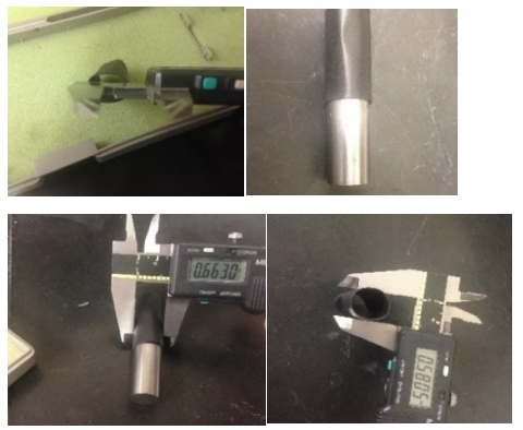 由于熱縮套管是軟的,無法用游標(biāo)卡尺等東西準(zhǔn)確量出內(nèi)徑或外徑,TE給出的檢測(cè)建議是運(yùn)用塞規(guī),當(dāng)塞規(guī)緊貼著熱縮套管內(nèi)壁塞進(jìn)去的時(shí)分,此時(shí)塞規(guī)的外徑規(guī)范就是熱縮套管的內(nèi)徑D1;此時(shí)用游標(biāo)卡尺檢測(cè)熱縮套管外徑D2。那么熱縮套管壁厚T=(D2-D1)/2。