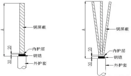 (2) 剝切電纜本道工序時不得傷及下一結(jié)構(gòu)層。可剝離半導(dǎo)電層的剝除可采用劃痕法,不可剝離半導(dǎo)電層的剝除可采用專用刀具或玻璃片刮法,不論使用何種方法都要保證剝除半導(dǎo)層后的絕緣層光滑、圓整、無劃痕;打磨過絕緣屏蔽的砂紙禁止再用來打磨電纜絕緣,處理過的屏蔽層斷口不應(yīng)有凹槽、缺口或突起。