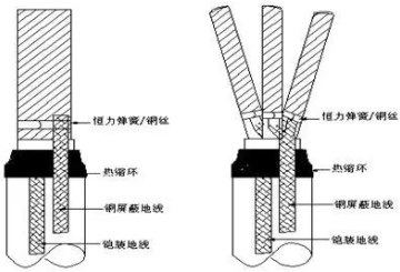 用砂布清除鎧裝層及銅屏蔽的防腐層,露出金屬光澤;將地線使用恒力彈簧固定于鎧裝或銅屏蔽上(也可將地線使用銅絲綁扎與固定位置,再用中性焊劑和焊藥在綁扎位置滿焊,焊接后需清除毛刺)。如銅屏蔽為銅絲屏蔽則將銅絲反折做地線使用。此處兩地線不可短接,鎧裝處收縮一熱縮環(huán)或纏繞絕緣自粘膠帶。