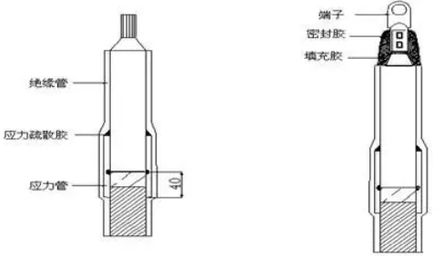 插入端子并壓接,壓接后去除毛刺和飛邊(如為三芯電纜,需保證端子端面方向一致)。在絕緣管斷口與端子之間以及端子壓接部位包繞填充膠,使絕緣管斷口與端子之間呈錐形過渡,再在其外面繞一層密封膠條。