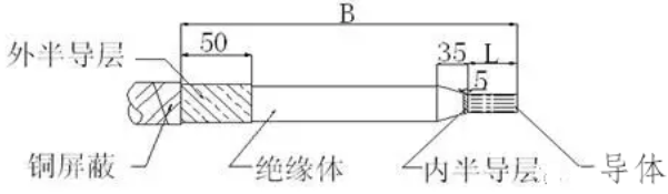 如圖8,尺寸剝除電纜銅屏蔽層、半導(dǎo)層、以及絕緣層(L=1/2連接管長度+2mm),并且將電纜絕緣末端削成35mm長的錐形(其中5mm為外露的內(nèi)半導(dǎo)層)。