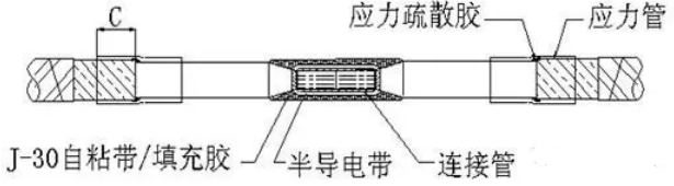 打磨并清潔線芯絕緣層,確保表面無導(dǎo)電顆粒殘留,在外半導(dǎo)層斷口處纏繞應(yīng)力疏散膠,搭接絕緣層及外半導(dǎo)層各5mm,在絕緣層表面均勻薄涂一層硅脂膏,應(yīng)避免涂在外半導(dǎo)層上。套入應(yīng)力管,搭接半導(dǎo)層C,加熱收縮固定(如應(yīng)力管為通長型,則應(yīng)在導(dǎo)體連接后再固定。