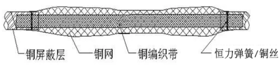 將每相預(yù)先套入的屏蔽網(wǎng)移到接頭中間位置,向兩邊均勻拉伸搭接兩端的屏蔽層,使之緊密覆蓋在半導(dǎo)體電管上(纏繞法則是以搭接約1/4的方式將屏蔽銅網(wǎng)纏繞至半導(dǎo)層上),用砂布打磨銅屏蔽,露出金屬光澤;將地線使用恒力彈簧固定于銅屏蔽上(也可將地線使用銅絲綁扎與固定位置,再用中性焊劑和焊藥在綁扎位置滿焊,焊接后需清除毛刺),如銅屏蔽為銅絲屏蔽則直接使用連接管壓接。