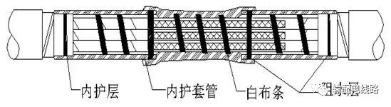 將內(nèi)、外護(hù)套分別套進(jìn)兩端電纜,在電纜護(hù)層被剝除較長的一端每相分別套入一組內(nèi)絕緣管、中絕緣管、外絕緣管和半導(dǎo)管(20kV以下無中壁管,外絕緣管和半導(dǎo)管也可使用復(fù)合管替代),在短端每相套入一段銅屏蔽網(wǎng)(以纏繞的方式恢復(fù)金屬屏蔽層則不需套入)。按原定相序?qū)⒕€芯插入連接管并進(jìn)行壓接,去除連接管表面的毛刺、棱角,并將廢屑清理干凈。先用半導(dǎo)帶纏繞在連接管表面,使其和兩端的內(nèi)半導(dǎo)層相連,再將填充膠(20kV以上纏繞J-30絕緣自粘帶)纏繞與半導(dǎo)帶外及絕緣錐體部位,厚度為高出電纜本體絕緣外徑1-2mm,兩端搭接電纜本體絕緣5mm,并與其平滑過渡。