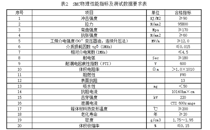 2.3.1分支箱外殼選用S304不銹鋼資料,箱體、門體資料厚度均不應(yīng)小于2毫米,或SMC復(fù)合資料箱體,SMC物理功用目標(biāo)及測試數(shù)據(jù)滿足表2的要求。