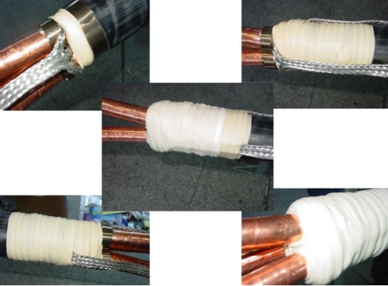 正確工藝:從一段鎧裝端口開端講防水帶拉長至1.5倍,以半搭疊方法繞包至另一端鎧裝端口,防水帶膠黏層應(yīng)緊貼電纜內(nèi)護(hù)套。