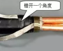用PVC膠帶在銅屏蔽層的開剝位置處作臨時固定并定位,沿PVC膠帶邊沿將銅帶撕斷,如有銅絲屏蔽則沿恒力彈簧向后翻轉(zhuǎn)。不得傷及外半導(dǎo)電屏蔽層和絕緣層,銅屏蔽斷口要均勻整齊,不得有尖角及快口,更不允許讓銅帶尖角刺入外半導(dǎo)電層。