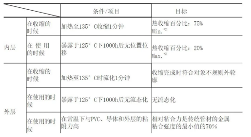 為了避免PVC線在熱縮短進(jìn)程中發(fā)生熱降解,有必要將進(jìn)程溫度控制在100°C或更低。為了滿意上述要求,咱們?cè)谧詣?dòng)縮短機(jī)中測(cè)量了最大加熱溫度和時(shí)刻,發(fā)現(xiàn)可以將管道加熱到135°C繼續(xù)一分鐘。將管道加熱到此溫度時(shí),其外層有必要完全縮短,而內(nèi)層則需求活動(dòng)并契合被遮蓋對(duì)象的不規(guī)則外部概括。另一方面,在125°C的運(yùn)用溫度下,要求管道顯現(xiàn)出恰當(dāng)?shù)慕^緣和密封功能,一起又不使管道和粘合劑位移。表2和表3別離顯現(xiàn)了用于新管的資料的開(kāi)發(fā)方針及其方針特性。