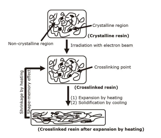 熱縮短管在受熱時(shí)縮短的原理如圖3所示。當(dāng)電子束傳輸?shù)接山Y(jié)晶區(qū)和非結(jié)晶區(qū)組成的結(jié)晶樹(shù)脂*4時(shí),樹(shù)脂分子在非晶區(qū)域相互銜接。成果,樹(shù)脂轉(zhuǎn)變?yōu)榫哂性诜蔷^(qū)域中構(gòu)成的交聯(lián)點(diǎn)的交聯(lián)樹(shù)脂。經(jīng)過(guò)加熱使交聯(lián)樹(shù)脂脹大,然后冷卻并固化為熱脹大的交聯(lián)樹(shù)脂。當(dāng)將熱脹大的交聯(lián)樹(shù)脂加熱到等于或高于晶體區(qū)域的熔點(diǎn)的溫度時(shí),晶體熔化并變軟。成果,因?yàn)榇嬖诮宦?lián)點(diǎn),樹(shù)脂縮短成脹大前的形狀(形狀記憶效應(yīng))。(1)