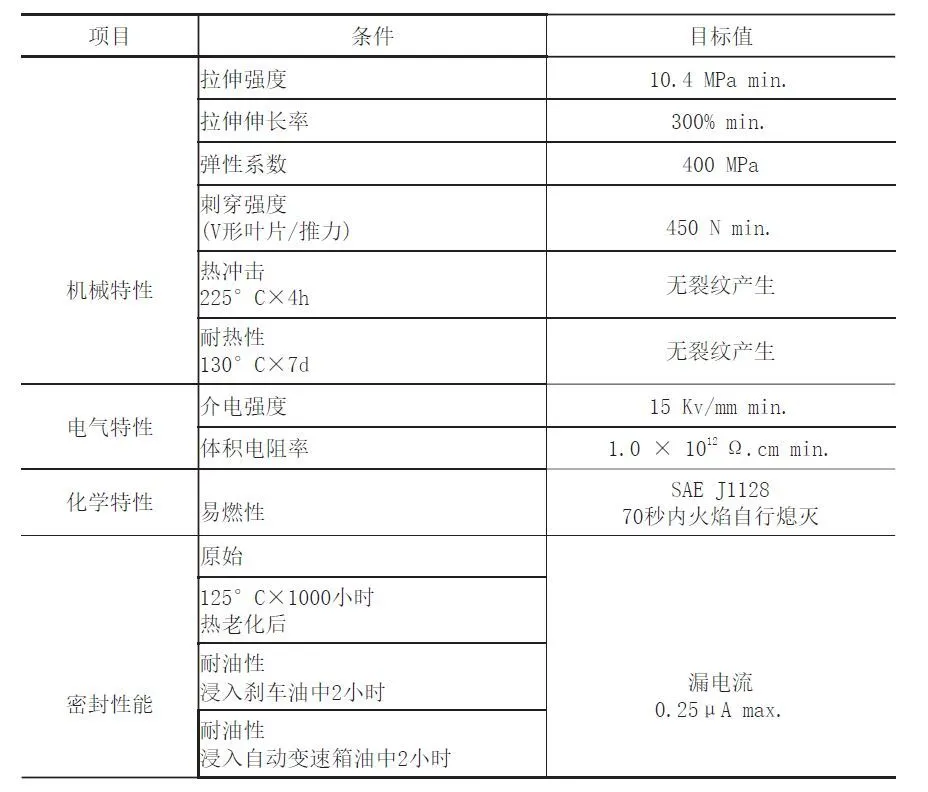 為了防止PVC線在熱收縮過程中發(fā)生熱降解,必須將過程溫度控制在100°C或更低。為了滿足上述要求,我們在自動收縮機中測量了最大加熱溫度和時間,發(fā)現(xiàn)可以將管道加熱到135°C持續(xù)一分鐘。將管道加熱到此溫度時,其外層必須完全收縮,而內(nèi)層則需要流動并符合被遮蓋對象的不規(guī)則外部輪廓。另一方面,在125°C的使用溫度下,要求管道顯示出適當?shù)慕^緣和密封性能,同時又不使管道和粘合劑位移。表2和表3分別顯示了用于新管的材料的開發(fā)目標及其目標特性。