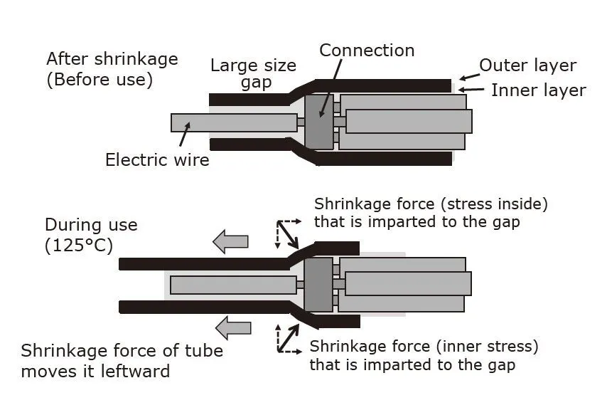 由于高密度聚乙烯(HDPE)*5的彈性系數(shù)高于其他類型的聚乙烯,因此有望提供高機械強度。然而,發(fā)現(xiàn)HDPE在加熱到135℃(略低于其熔點的溫度)一分鐘時不能充分收縮。相反,其他類型的聚乙烯在加熱到125°C時會收縮,但在125°C的使用溫度下會軟化,從而在徑向方向上產(chǎn)生內(nèi)應(yīng)力并滑出其預(yù)期位置(圖5)。
