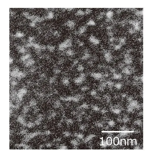 隨后,我們測試了通過向聚酰胺樹脂中添加少量烯烴橡膠制成的聚合物合金(圖9)。在該測試中,該聚合物為聚酰胺樹脂提供了對聚乙烯的高附著力,同時保持了聚酰亞胺樹脂對PVC和金屬的高附著力。相結(jié)構(gòu)的透射電子顯微鏡的結(jié)果(圖10)表明,烯烴橡膠以納米級細分散。我們得出的結(jié)論是,聚酰胺樹脂和烯烴橡膠之間的界面強度增加以及應(yīng)力集中阻力的增加導(dǎo)致聚合物合金粘合性的增加。